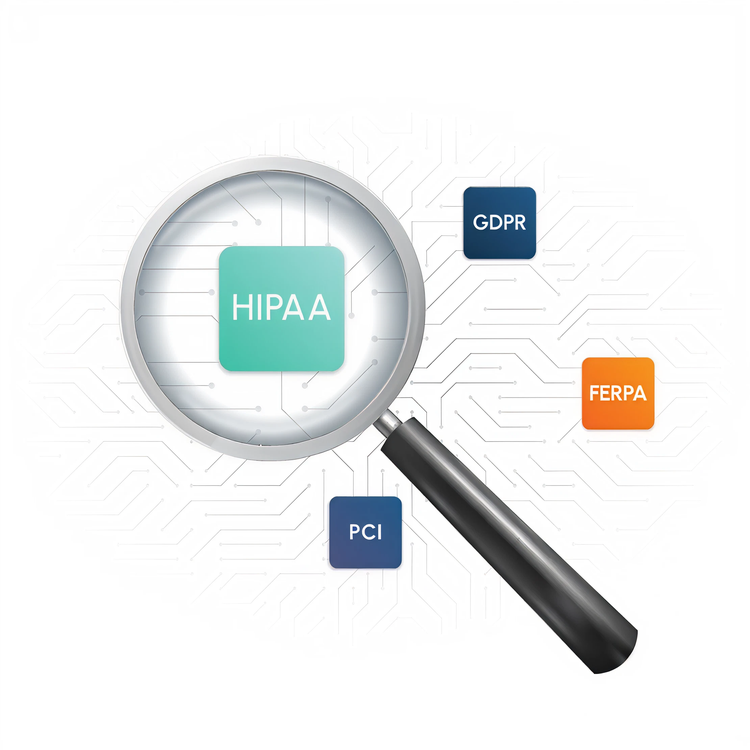 A magnifying glass highlighting a HIPAA icon, surrounded by floating badges for GDPR, FERPA, and PCI over a digital circuit background, symbolizing regulatory focus.